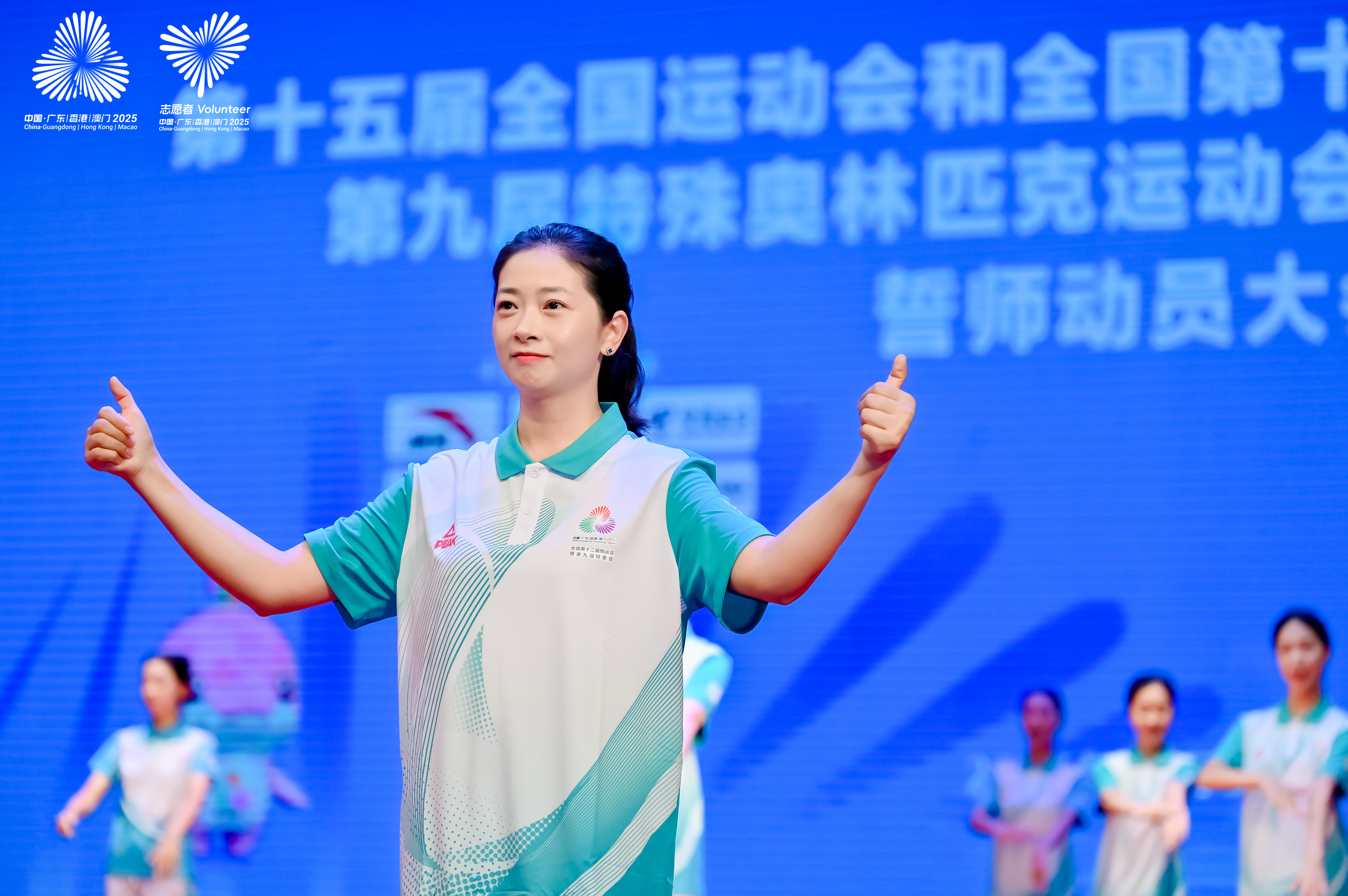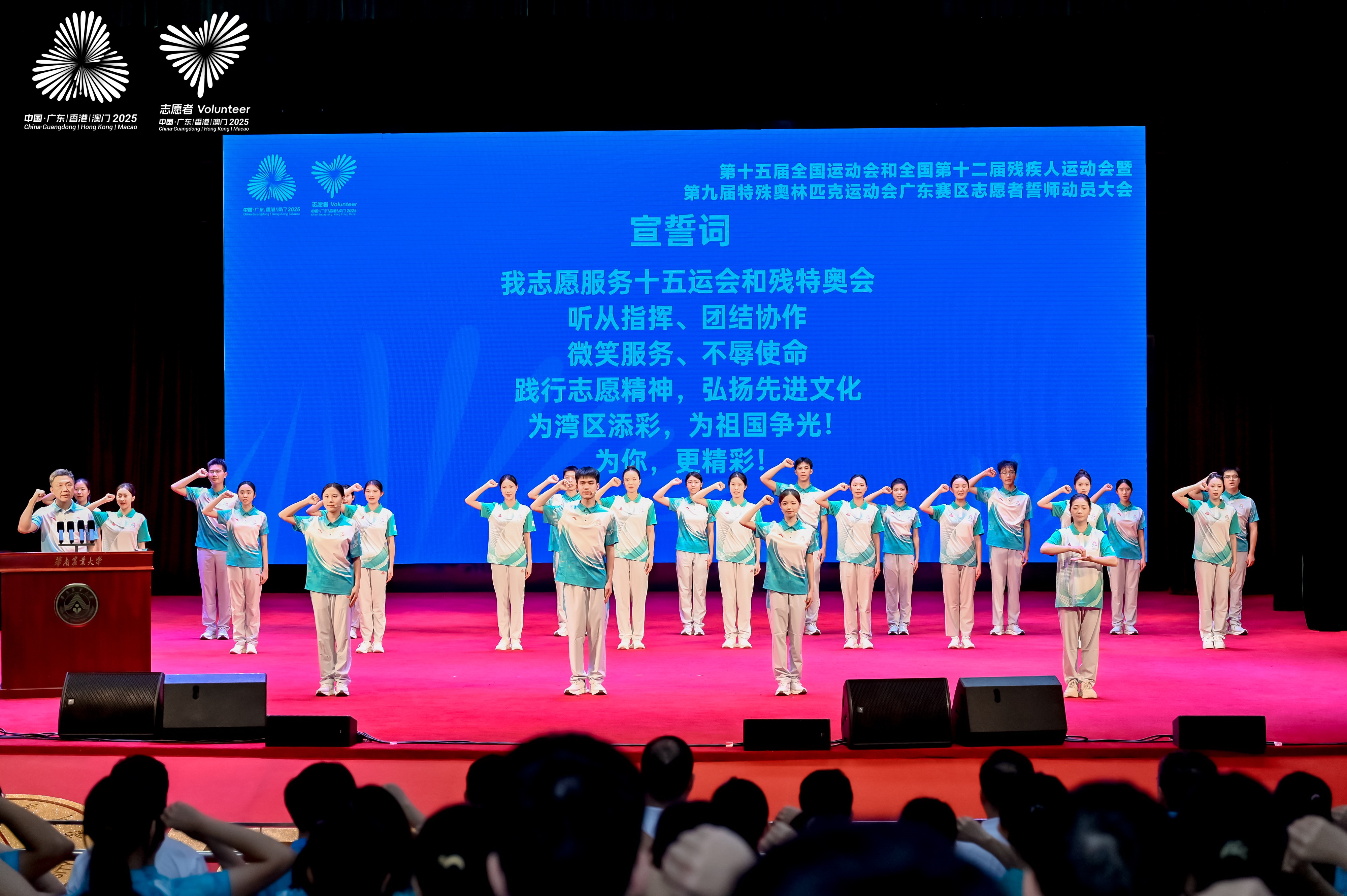 会上,十五运会广东赛区赛会志愿服务队、残特奥会广东赛区赛会志愿服务队获授旗;十五运会广东赛区城市志愿服务队、残特奥会广东赛区城市志愿服务队获授旗。350名赛会志愿者代表庄严宣誓:“我志愿服务十五运会和残特奥会,听从指挥、团结协作,微笑服务、不辱使命,践行志愿精神,弘扬先进文化,为湾区添彩,为祖国争光!为你,更精彩!”