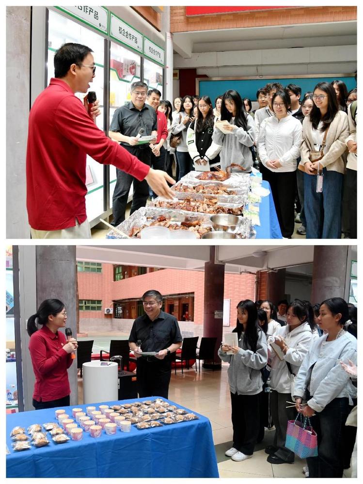 在畜禽产品区,艾民珉副教授向同学们分享了脆皮烤鸭的制作流程;在谷物产品区,黄卫娟副教授为同学们讲解了烘焙食品的制作小技巧;在红酒产品区,廖振林教授给同学们讲解了红酒的酿造工艺,并邀请同学们参加学校即将举行的第三届全国大学生葡萄与葡萄酒科学文化节;在功能食品区,陈运娇副教授带来了利用“冻眠技术”保鲜的荔枝和以荔枝为原料开发的饮品及衍生食品;在快检产品区,徐振林教授为同学们展示了食品安全快速检测的技术;在果蔬加工区,赵雷教授带着同学们走进生产线,请同学们品尝鲜橙果汁。在体验的过程中,同学们品尝了不一样的“华农味道”,体验了食品营养与食品安全背后的科技力量。
