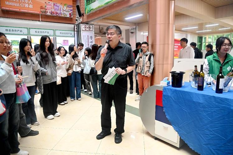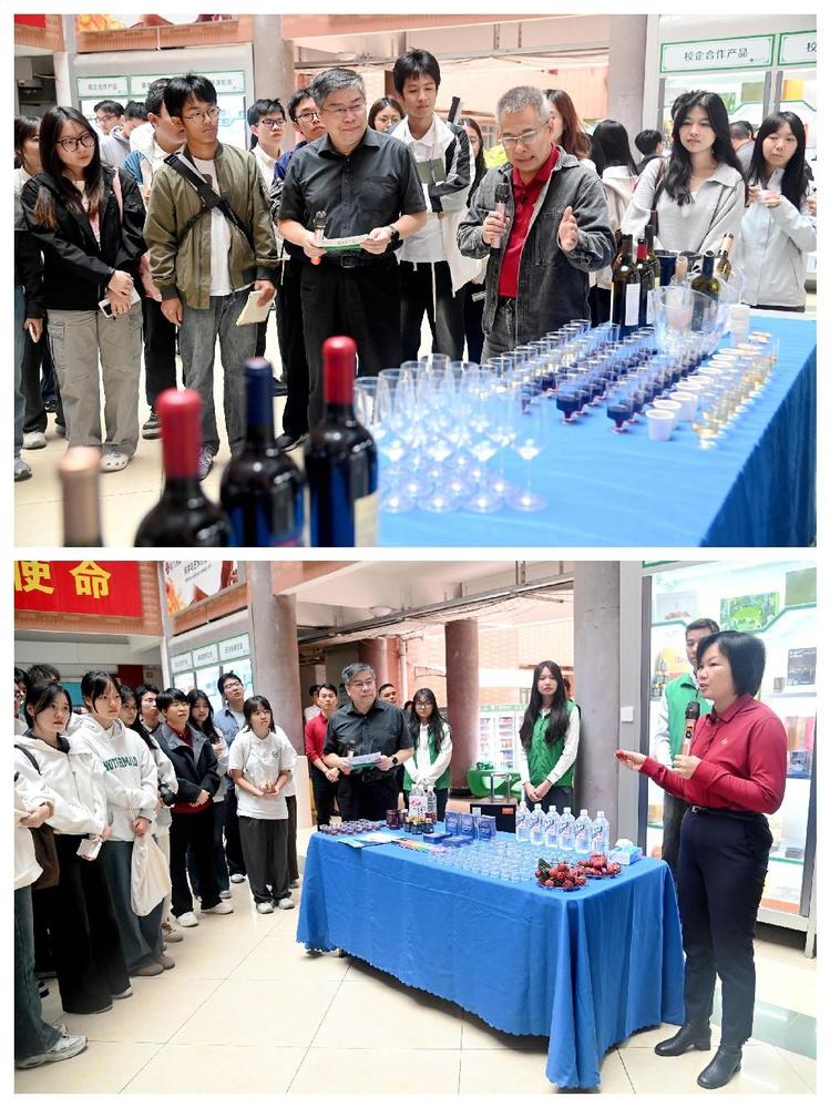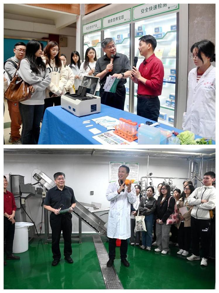 本次“行走的思政课”采取“实践体验”和“理论授课”相结合的形式展开,薛红卫带领同学们在畜禽产品区、谷物产品区、功能食品区、快检产品区、果蔬加工区等展示区逐一体验食品营养、食品安全等学科特色和科技创新成果,品尝烤鸭、饼干、红酒、果汁、冻眠荔枝等美食佳饮,深刻感悟大食物观的丰富内涵。