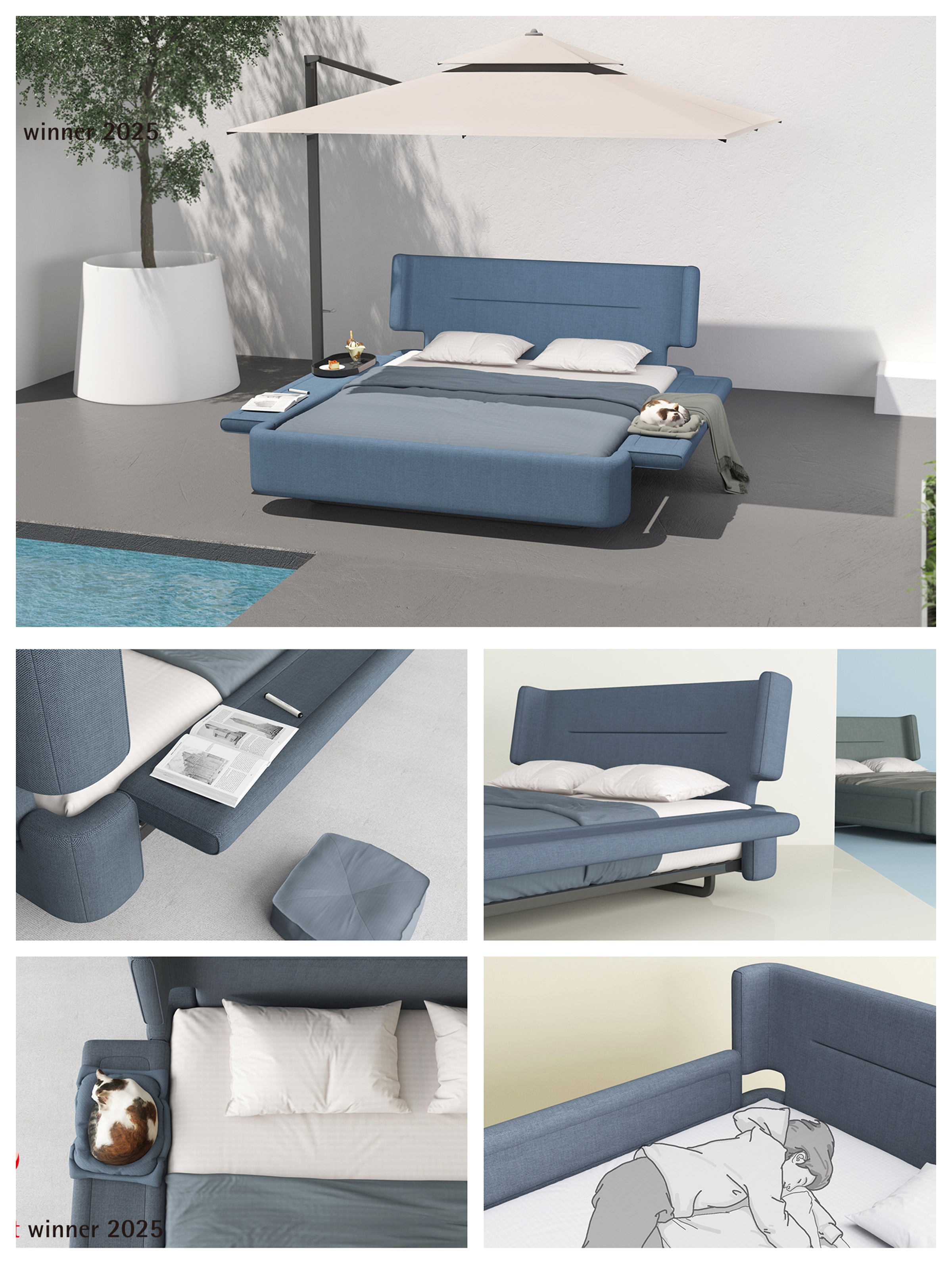 设计说明:Whale Bed的设计灵感来源于鲸鱼。后疫情时代户外休闲需求升级,作品精准契合市场趋势,通过简约外观设计减少材料消耗,同时融入多功能创新:床屏可像鲸鱼尾巴般摆动调节角度,适配不同坐卧姿势;床架两侧的鳍状功能板既可放置物品,也能作为宠物休憩空间。环保植物纤维面料的运用,使其兼顾室内外使用场景,适配庭院、泳池等休闲场所。该作品源自华农与慕思股份的产学研合作。