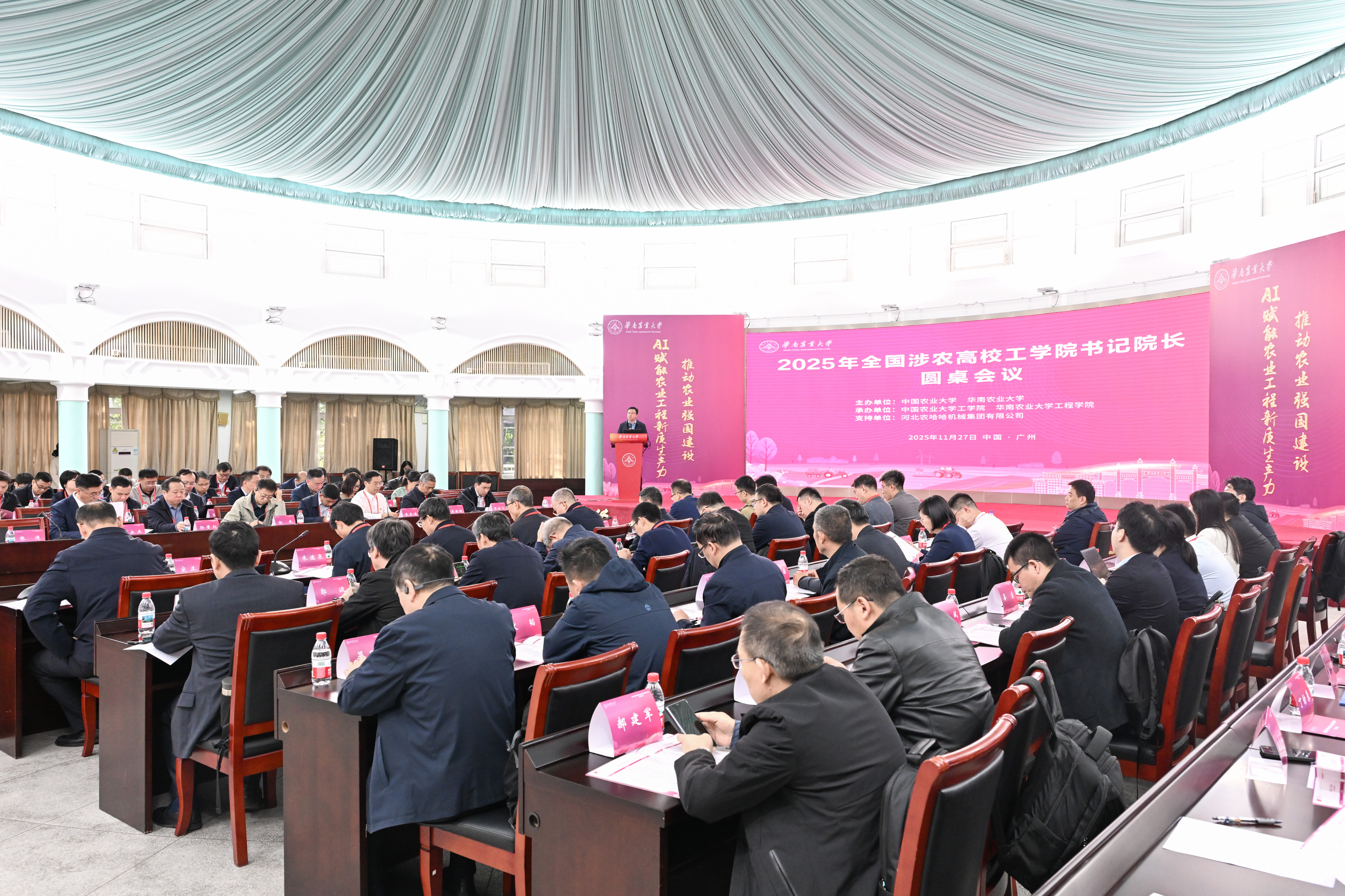 为加强全国涉农高校工学院之间的交流与合作,共同探讨农业工程领域科技创新与人才培养的新模式、新路径,11月27日,由中国农业大学和华南农业大学主办的2025年全国涉农高校工学院书记院长圆桌会议在华南农业大学红满堂报告厅举行。华南农业大学党委副书记陈磊,中国工程院院士、工程学院教授罗锡文出席会议并致辞,青岛农业大学副校长孟晓军、成都航空职业技术大学副校长许丽佳出席会议,来自全国有关涉农高校工学院的80余位领导专家参加活动。