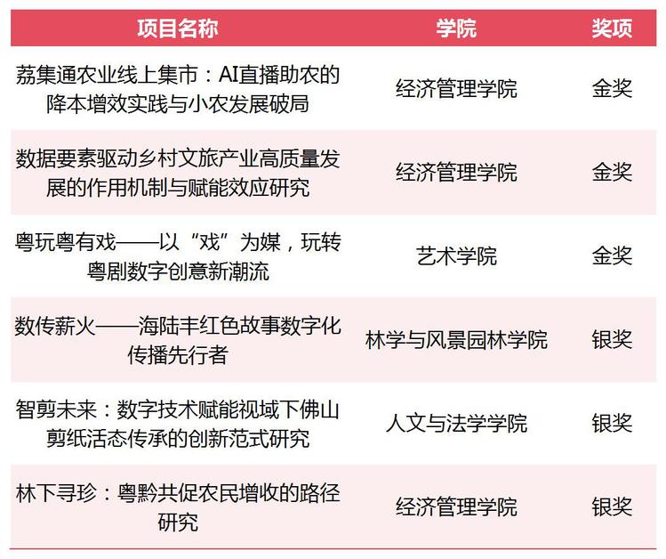 国赛佳绩的背后,是华农近年来系统性推进新文科建设、深化创新创业教育改革的坚实步履。作为华南地区唯一的农林类国家“双一流”建设高校,学校立足“跨出农兴农”的理念,大力推动学科交叉融合,通过推动前沿技术融入文科课程、建设“新文科创新试验班”等举措,鼓励文科生运用所学知识服务乡村发展与基层治理,打造具有华农特色的文科人才培养模式。目前,华农文科已建成6个国家级、7个省级一流专业建设点。