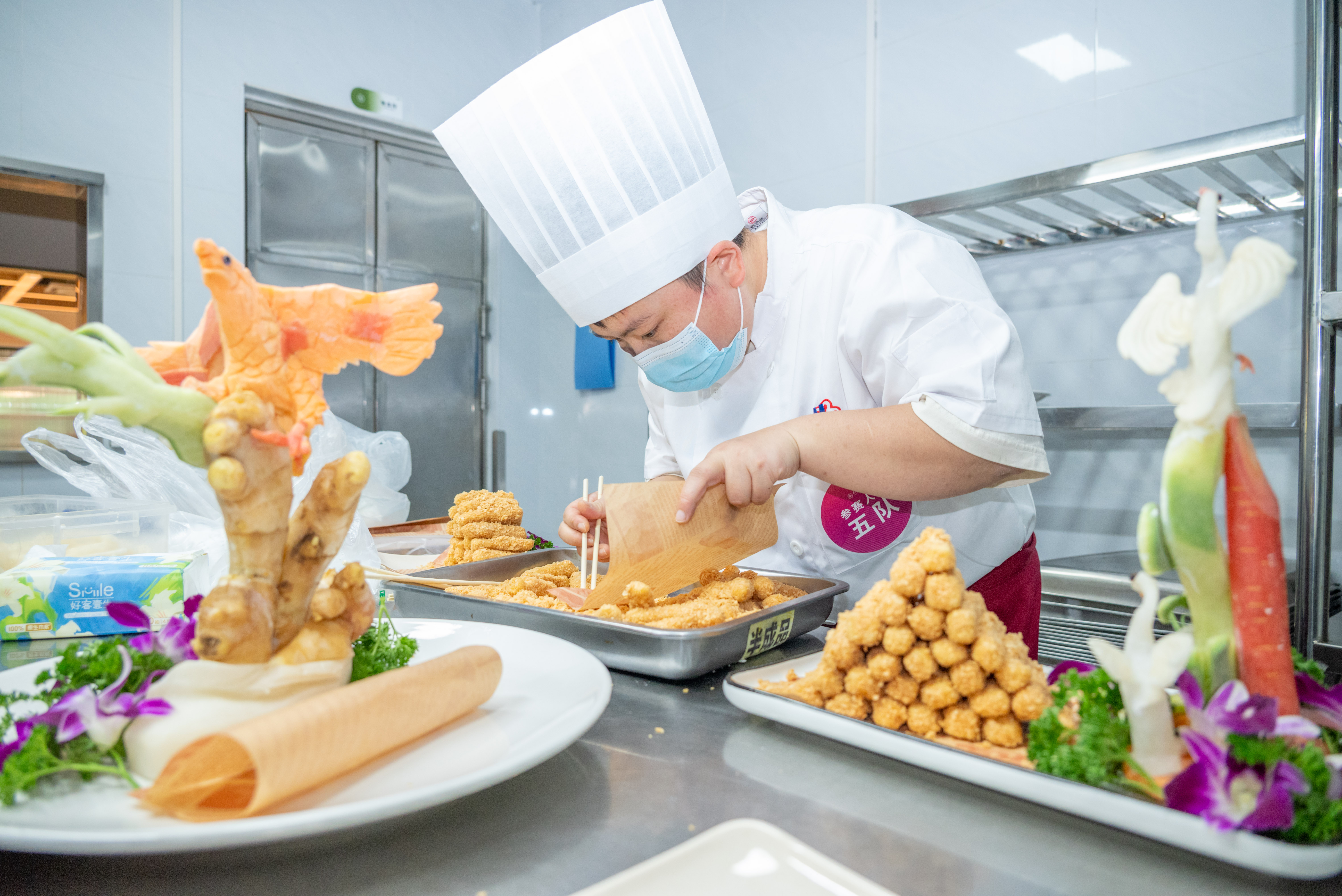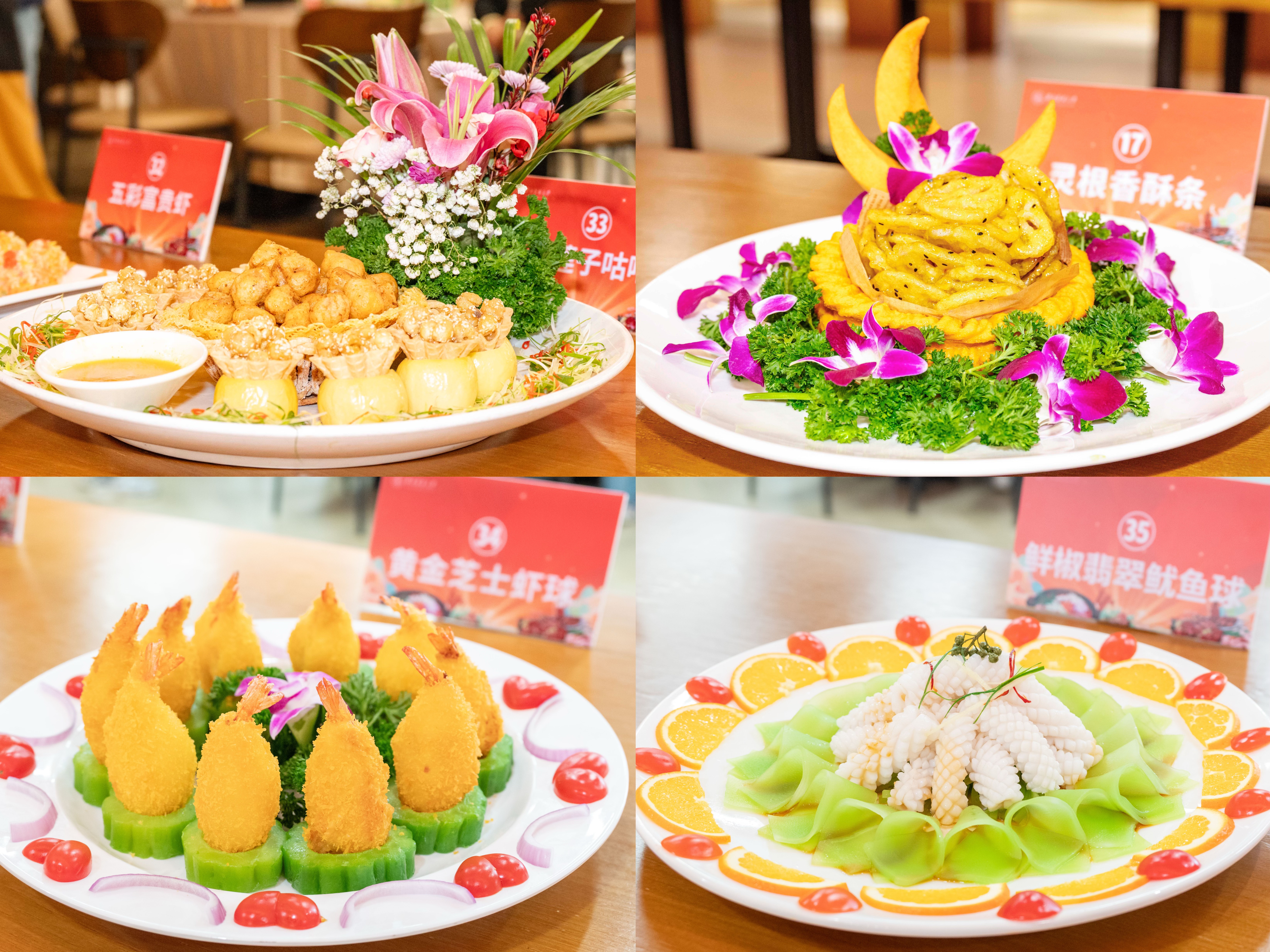比赛过程中,参赛选手严格按照比赛规程和操作规范,展示自己的精湛厨艺。菜品制作中,选手们团结协作,煎炸蒸炒,巧花心思,各显神通。现场蒸汽升腾、香味扑鼻,菜式造型外形可人。