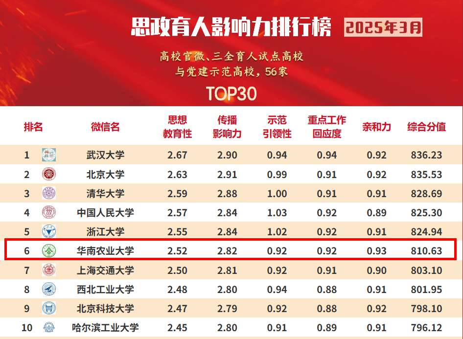 用“小切口”讲好“大故事”,让“正能量”汇聚“大流量”,学校官微传播品牌影响力、思政引领力稳居全国前列、全省第一方阵,4次跻身全国高校思政类公众号育人影响力榜单前十,5次登顶省教育厅高校官微、视频号月榜榜首。新闻作品获年度广东省高校宣传思想工作优秀作品一等奖3项、二等奖3项、三等奖1项,总数位列全省第二;学校获评“新媒体影响力双一流高校”“教育传播杰出学校”,入选首批“广报求学校媒新媒体联盟”;宣传科(融媒体中心)荣获学校首届“紫荆管理服务奖”集体奖,新禾融媒体工作室讲述的“三农”故事荣获学生社团品牌活动重点项目。