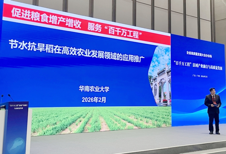会议在广州设主会场,在各地级以上市、各县(市、区)设分会场,并面向全省进行实况直播。华农校长薛红卫参会,并在“百千万工程”县域产业融合与高质量发展分会场作专题报告,分享了华农节水抗旱稻技术在广东水稻产业的应用推广成果。目前,华农已培育出多个适配广东生态的品种,同步探索形成配套绿色栽培技术,在省内13个地市开展试验推广,取得了显著的生态和经济效益。这也是华农通过科研创新深入服务“百千万工程”、守护广东粮食安全的生动缩影。