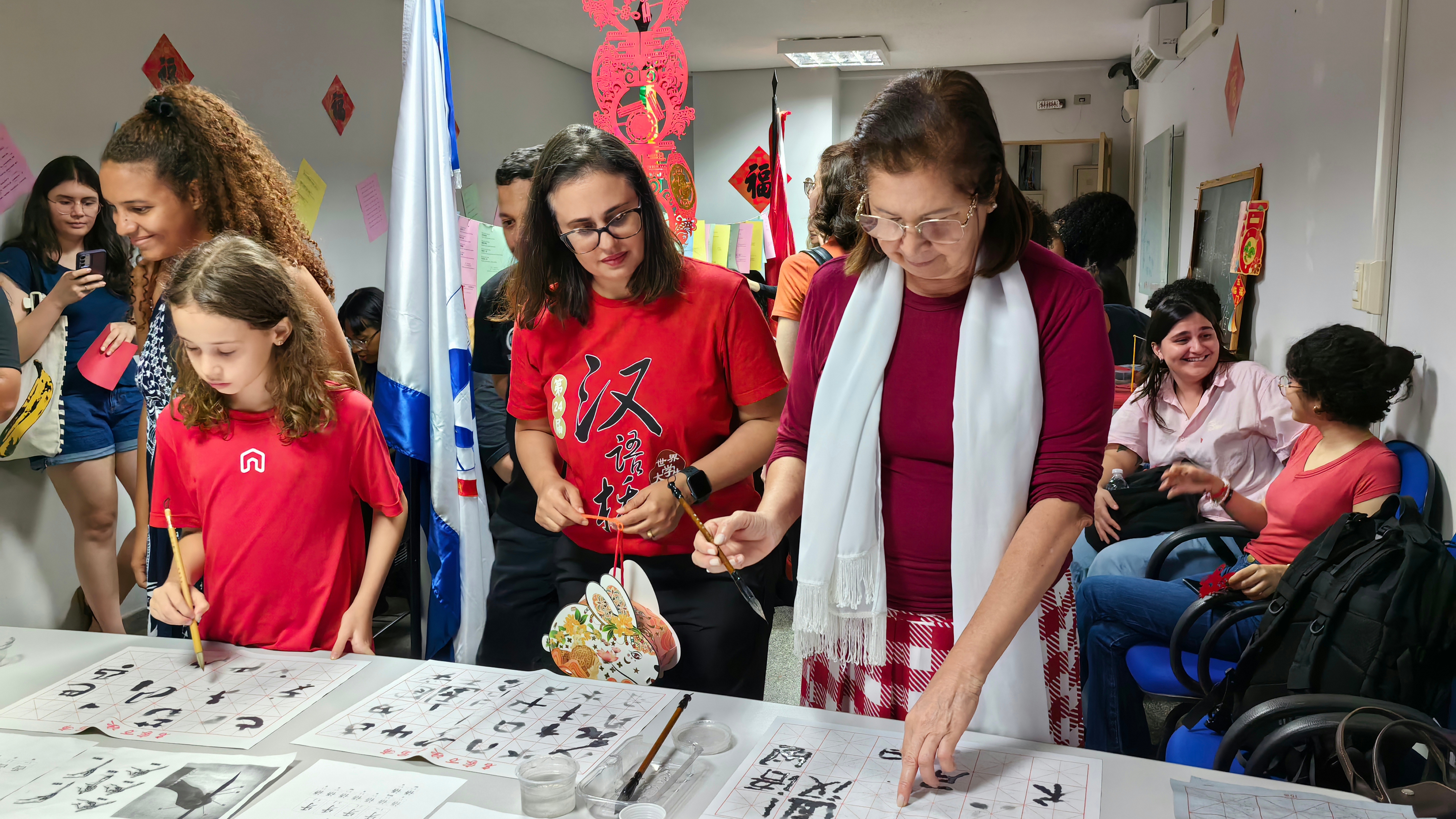 体验环节精彩纷呈,现场设置了多个中国文化互动展区:麻将、围棋、中国象棋等棋牌游戏区围满跃跃欲试的体验者;剪纸和中国结编织区,参与者在指导下完成了一件件充满中国风的手工作品;传统游戏投壶区更是吸引了众多挑战者,欢呼声此起彼伏。特别设计的灯谜融合了中巴两国文化元素,既考验智慧又充满趣味,成为活动亮点之一。书法体验区则让参与者们拿起毛笔,一笔一画感受汉字之美。活动现场还专门设置了新学期中文课程报名二维码,不少参与者当场扫码咨询,积极报名。
