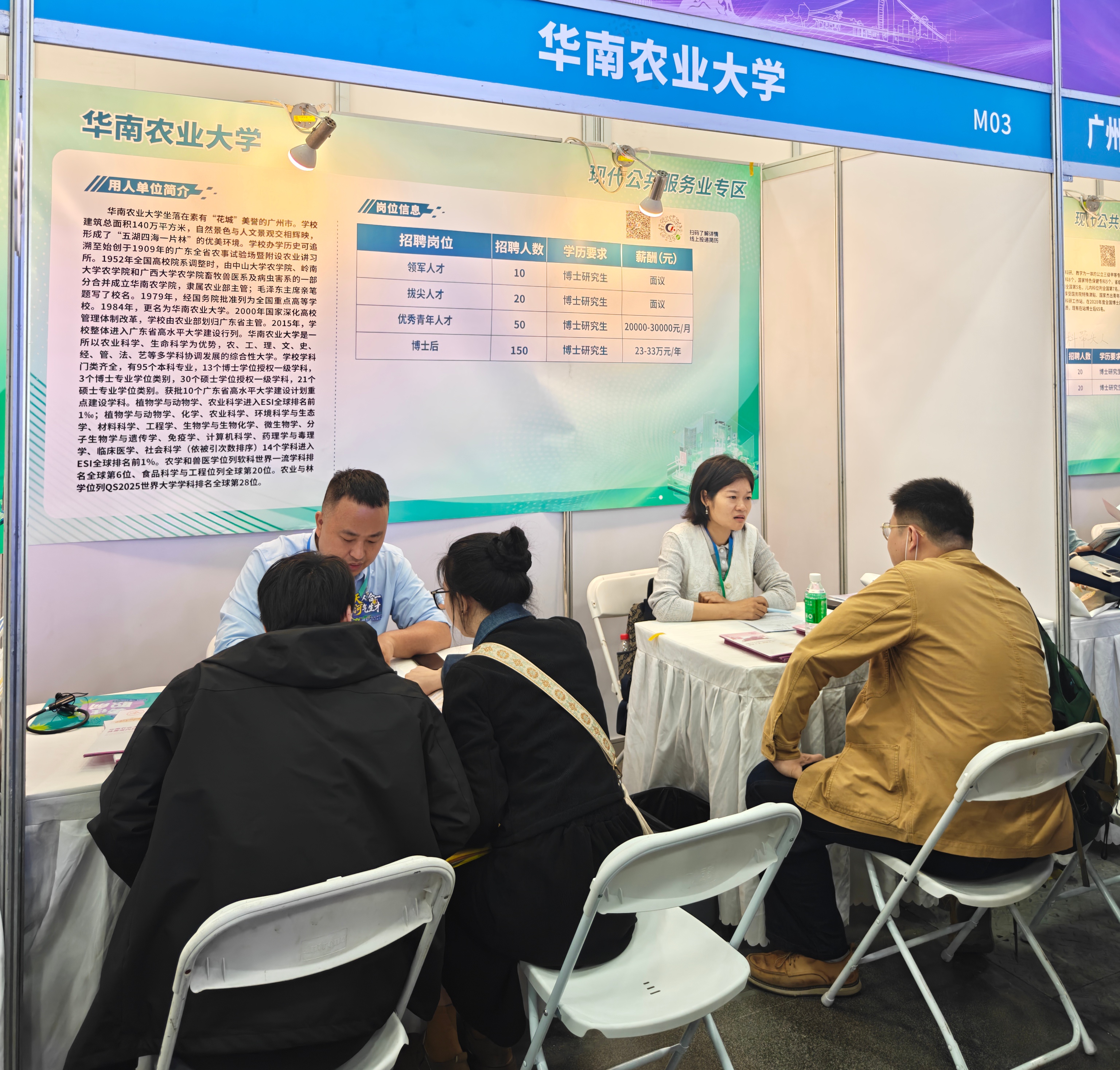 3月15日,由教育部和广东省委、省政府联合主办的“百万英才汇南粤”2026年春季大型综合招聘会在广州举行。华农亮相招聘会,主动出击招才揽才,面向全球招聘高层次人才和博士后。副校长陈乐天出席启动仪式。