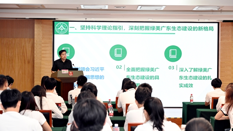 在总结授课中,薛红卫围绕习近平生态文明思想,向同学们阐释了习近平生态文明思想的核心要义和重要意义,介绍了绿美广东生态建设的具体部署和取得的扎实成效,并通过讲解华农人“爆改”河源小镇、节水抗旱稻实现“点荒成金”和“绿肥之王”紫云英还田化泥助春耕等案例,向同学们展示了服务绿美广东生态建设的华农担当。