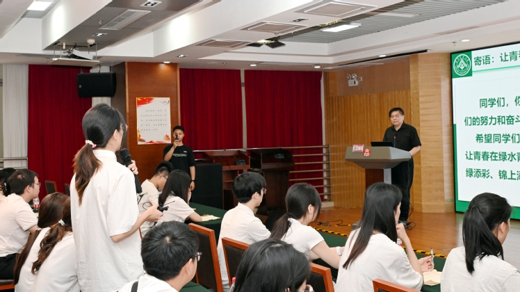 “华农学子如何以青春之力助力绿美广东生态建设?”薛红卫结合“万名学子大调研”“大学生创新大赛”取得的优异成果,激励华农学子充分发挥专业特长和学科优势,将个人的青春奋斗融入国家发展的绿色洪流,为美丽中国建设和绿美广东建设增绿添彩、锦上添花。一是要坚持培根铸魂,厚植生态文明素养沃土。要成为绿色发展理念最积极的传播者和实践者,以理想为基、以实践为径,在培根铸魂中厚植生态情怀,让绿色理念扎根心底、融入行动。二是要坚持深入实践,赋能乡村生态文明建设。要以实践为笔、以青春为墨,在乡村生态文明建设中躬身力行,让绿水青山成为乡村振兴底色。三是要坚持攻坚克难,筑牢生态治理技术根基。当以科技为刃、以担当为剑,直面生态治理挑战,用硬核本领筑牢生态安全屏障。
