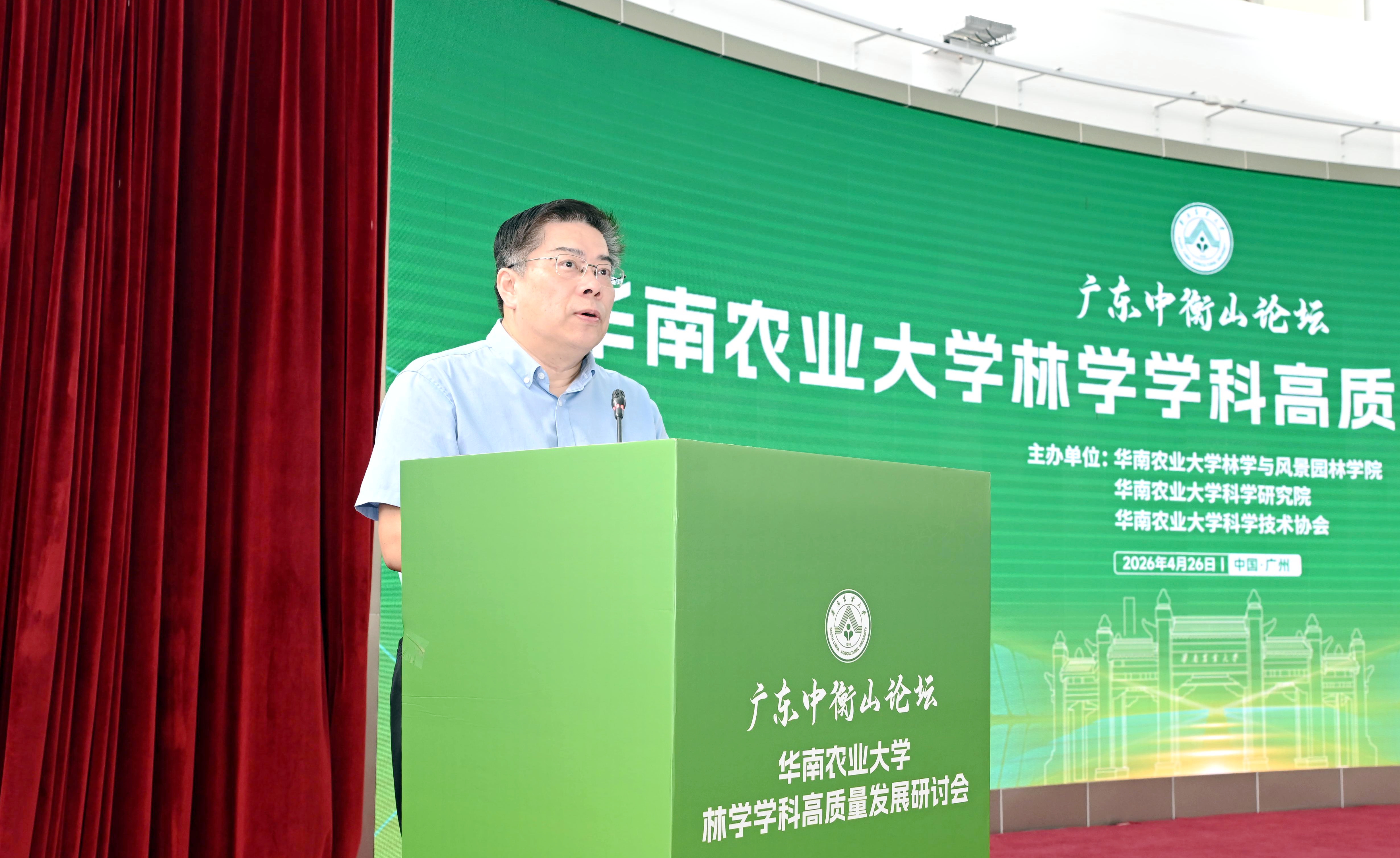 4月26日,第27期广东中衡山论坛暨华南农业大学林学学科高质量发展研讨会在华农红满堂举行。本次研讨会汇聚了来自中国科学院、中国林业科学研究院、中国农业科学院、北京林业大学、南京林业大学、西南林业大学、福建农林大学、浙江农林大学、河南农业大学、华南农业大学等全国多所知名高校、科研院所的专家学者和校(院)长。广东省农业农村厅、广东省林业局相关负责人,华南农业大学校长薛红卫、副校长仇荣亮参加活动。